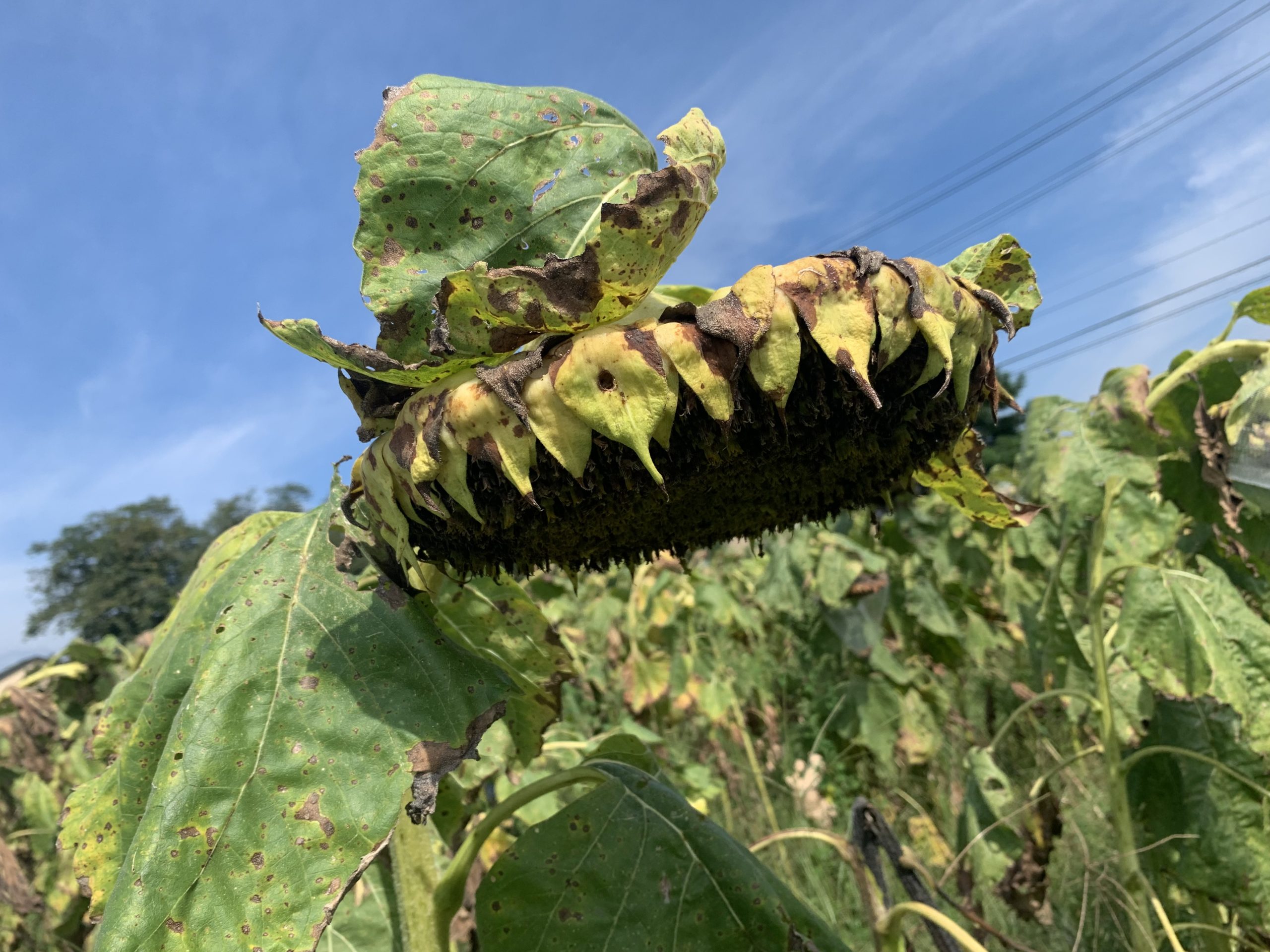 ひまわりはたくさんの種をつけて、稲穂が首を垂れるが如く、首を垂れています。