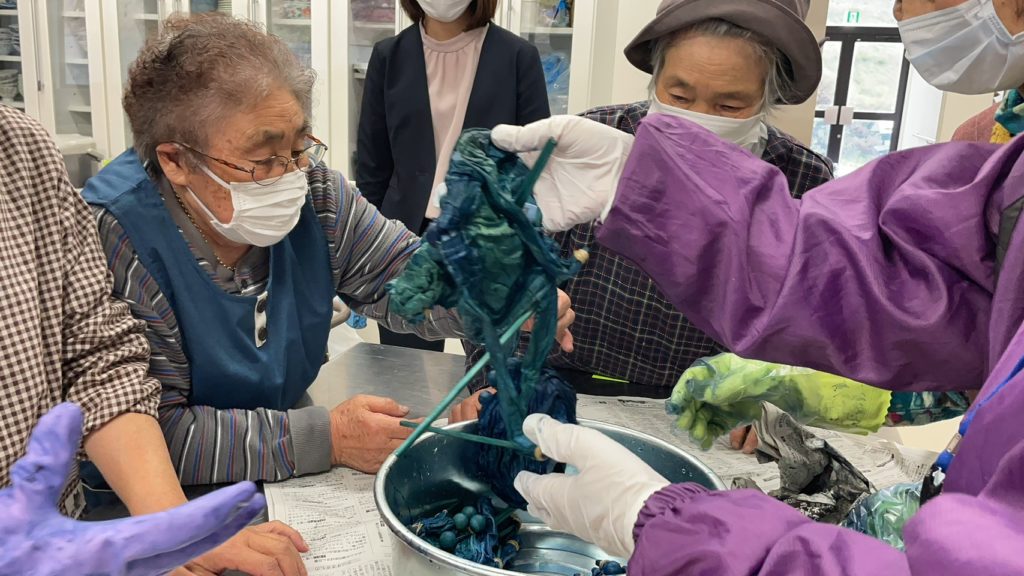 見て、触れて、感じる藍染めの世界にみなさんが夢中になり、先生とのコミュニケーションもバッチリです。