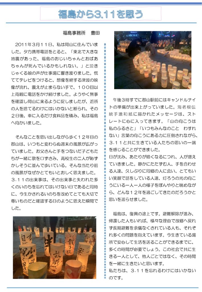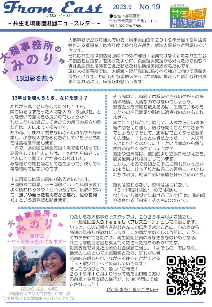 2023.03.21 FROM-EAST(ニュースレター)19号本部事務局 2023年3月11日。 東日本大震災から12年。 ニュースレター19号で岩手・宮城・福島の現地の様子を書き綴りました。 ※画像をクリックするとPDFで表示されます。 < 前の記事 次の記事 > CATEGORY お知らせ 大槌事務所 大船渡事務所 支援プロジェクト 未分類 本部事務局 災害ケースマネージメント 災害支援 物資提供 石巻事務所 福島支援 被災地状況 陸前高田市ユニバーサル就労支援センター