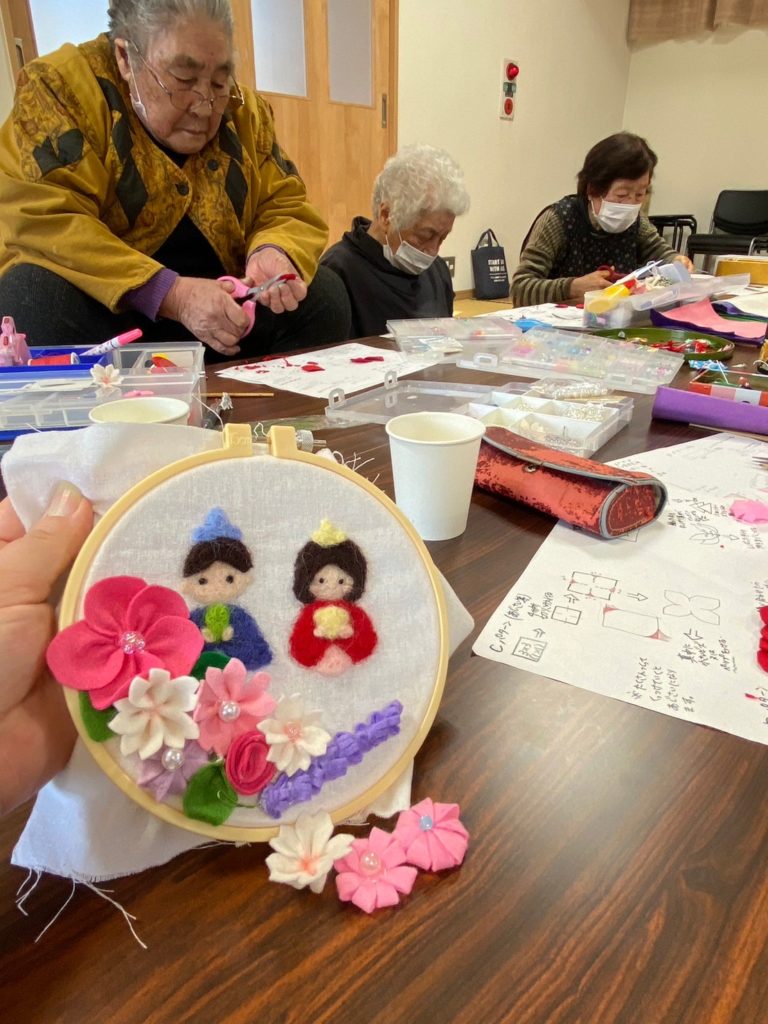 今回は本当に細かい作業が多く、羊毛をピンで刺す際手を刺してしまうのではないかと心配でしたが大きなケガもなく、それどころかみなさんで協力し、つまみ細工や裁縫で作った花を飾り、控えめだけどちょっと豪華なかわいい雛飾りが完成しました。