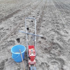 写真にあるライン(白線)引きのような道具で種を蒔きます。