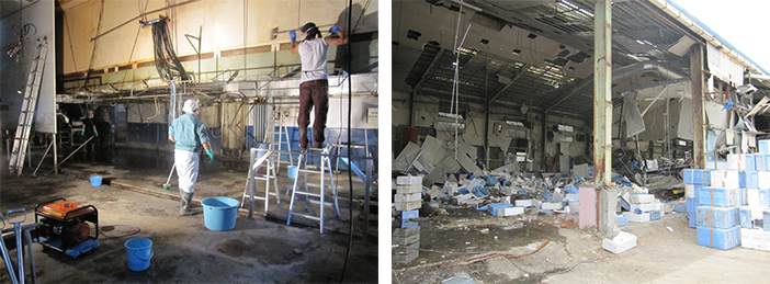 本社、工場ともに津波の被害を受け、土砂のかき出しから以前より製造していた練り物製品の生産再開までの作業を共に行いました。
